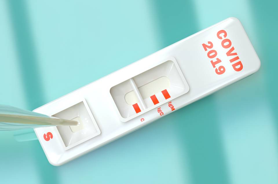 COVID19 SARS virus quick test. Rapid Covid 19 test with pipette putting a sample. 3d illustration. Tests are effective in detection of production of antibodies including IgM and IgG