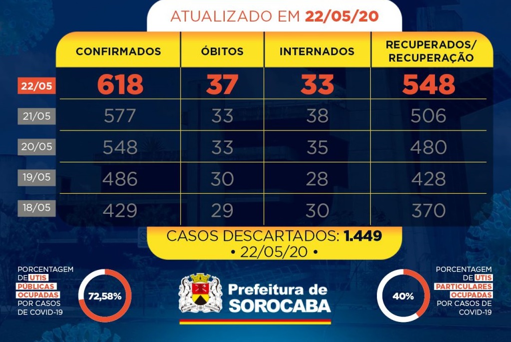 Mais 41 novos casos do novo coronavírus foram confirmados nesta sexta-feira (22) em Sorocaba. Com isso, a cidade chegou ao total de 618 casos. Deste total, 33 estão internados (16 em UTI) e o total de recuperados ou em estado de recuperação atingiu 548. Os óbitos com a confirmação da doença aumentaram de 33 para 37.