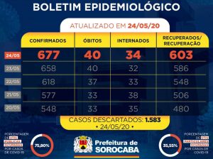 Com isso, o município chega a 677 diagnósticos positivos da doença. Deste total, 34 estão internados (14 em UTI) e o total de recuperados e/ou em estado de recuperação atingiu 603. Os óbitos com a confirmação da doença continuam em 40.