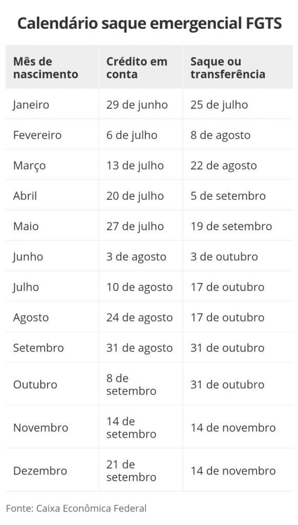O pagamento do saque emergencial do Fundo de Garantia do Tempo de Serviço (FGTS) começará no fim de junho e irá até o meio de novembro. As datas serão organizadas de acordo com o mês de nascimento dos beneficiados. De acordo com a estimativa da Caixa, 60 milhões de pessoas receberão, cada uma, R$ 1.045 em todo o país.