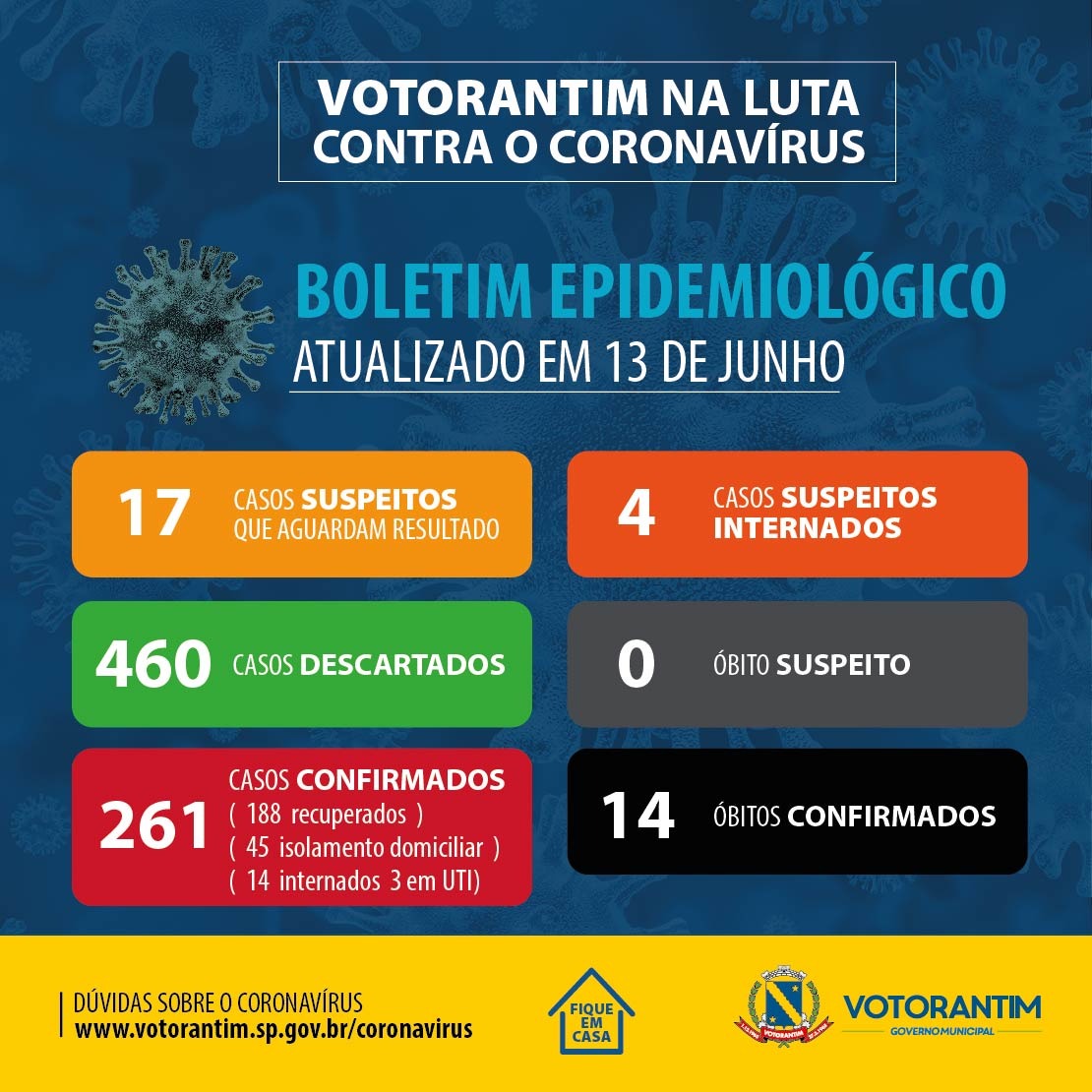 A Prefeitura de Votorantim, por meio da Secretaria Municipal da Saúde (Sesa), confirmou neste sábado (13) mais quatro casos de Covid-19. Com isso a cidade soma 261 notificações confirmadas, sendo 14 óbitos.