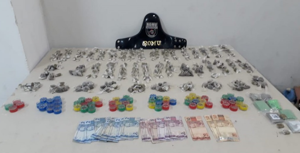Já na abordagem, em revista pessoal foi localizado com o rapaz a quantia de R$167,00 em espécie e na caixa que portava havia 41 porções de maconha, ainda numa caçamba de entulho próxima, que o indivíduo utilizava para abastecer de drogas a caixa, foi localizada uma sacola plástica contendo 403 porções de maconha e 64 porções de skank.
