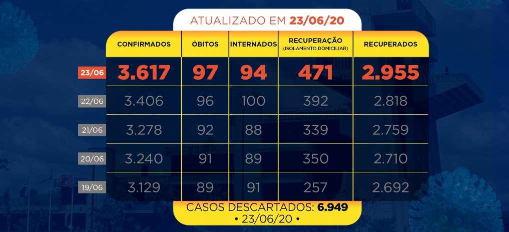 Também nesta terça-feira (23), a cidade contabilizou mais uma morte por conta da covid-19. A vítima foi um homem de 74 que era cardiopata e tinha câncer de rim. Ele faleceu no dia 19 de junho num hospital particular da cidade de São Paulo.
