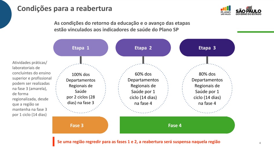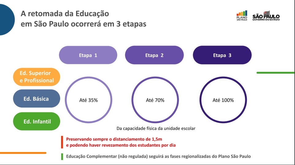 A retomada das aulas será feita em 3 etapas para o ensino infantil, fundamental, médio e faculdades.