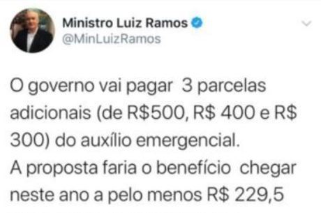 A mensagem do ministro Ramos dizia que a soma do auxílio daria R$229 bilhões. “O governo vai pagar três parcelas adicionais (de R$ 500, R$ 400 e R$ 300) do auxílio emergencial. A proposta faria o benefício chegar neste ano a pelo menos R$ 229,5 bilhões. Isso é 53% de toda a transferência de renda já feita no programa Bolsa Família desde o seu início, em 2004”, publicou na mensagem que foi apagada em seguida.