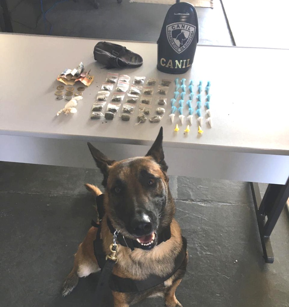 O cão farejador localizou 4 porções de crack; 25 porções de maconha, 33 porções de cocaína e a quantia de R$ 14,00 distribuídos em três lugares distintos.