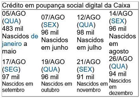 A portaria diz ainda que nas datas indicadas nesse calendário, os recursos estarão disponíveis apenas para o pagamento de contas, de boletos e para realização de compras por meio de cartão de débito virtual ou QR Code.