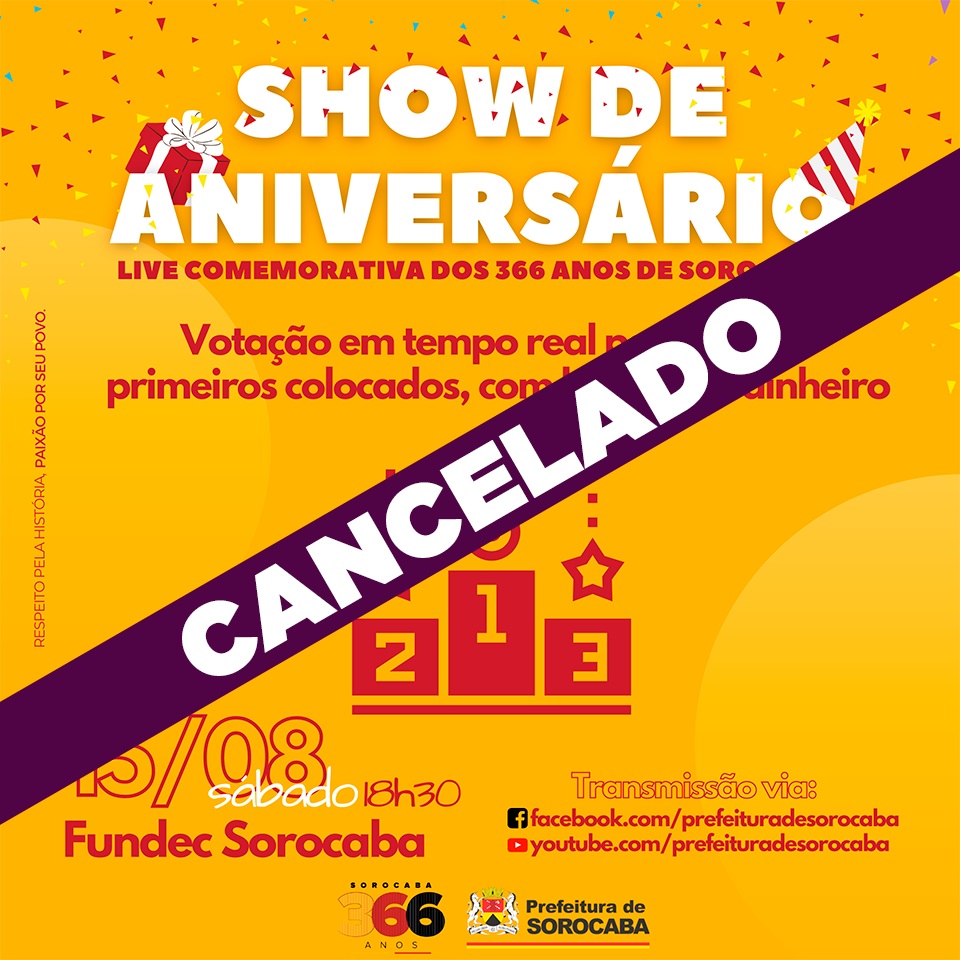 O “Show de Aniversário: Live Comemorativa dos 366 anos de Sorocaba”, que seria realizado neste sábado (15), em parceria com a Fundec, que fazia parte da programação do aniversário da cidade, foi cancelado.