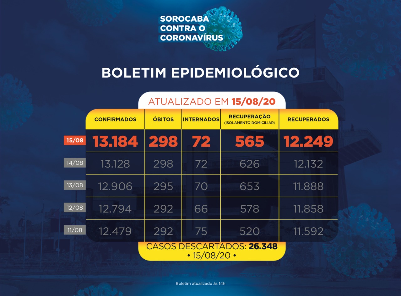Hoje, o município recebeu a notificação de mais 56 novos casos confirmados da doença neste sábado (15), passando de 13.128 para 13.184 de diagnósticos positivos na cidade.