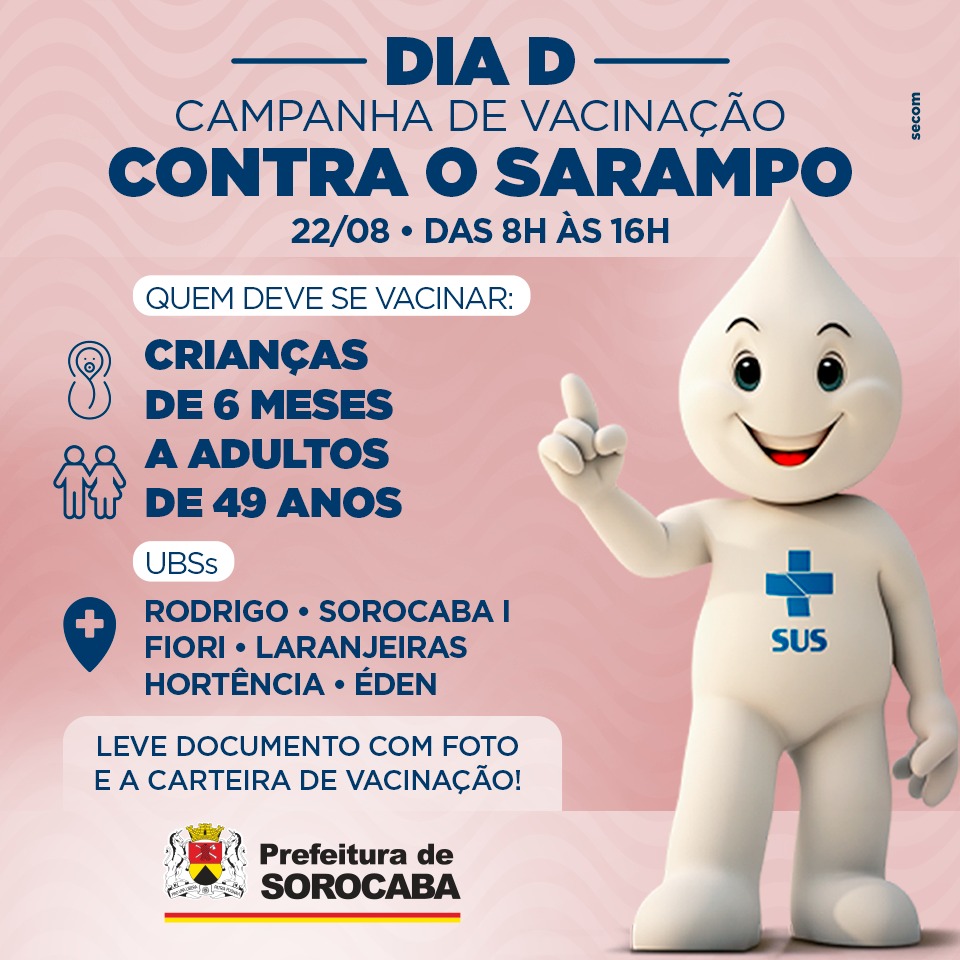 A Secretaria Municipal da Saúde realiza neste sábado (22), em Sorocaba, o ‘Dia D’ da vacinação contra o sarampo.