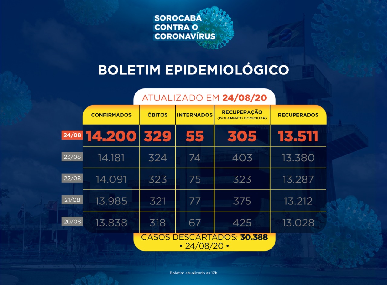 Sorocaba recebeu a notificação de mais 19 novos casos confirmados da Covid-19 nesta segunda-feira (24).