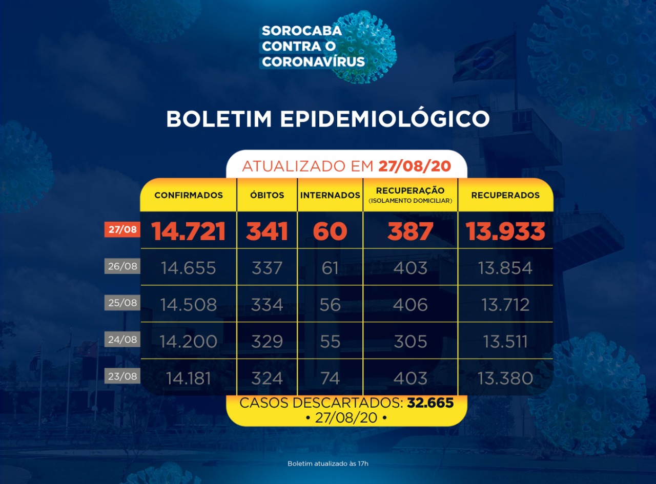 A Secretaria Municipal da Saúde registrou 13.933 recuperados da Covid-19, nesta quinta-feira (27),em Sorocaba. Já os casos confirmados com a doença passaram de 14.655 para 14.721 na cidade. Os óbitos com a confirmação da doença aumentaram de 337 para 341.