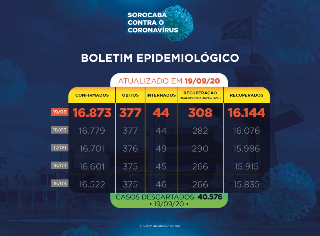 A Prefeitura de Sorocaba, por meio da Secretaria da Saúde (SES), registrou 16.144 recuperados da Covid-19, neste sábado (19). Já os casos confirmados com a doença passaram de 16.779 para 16.873 na cidade. Os óbitos com a confirmação se mantiveram em 377.