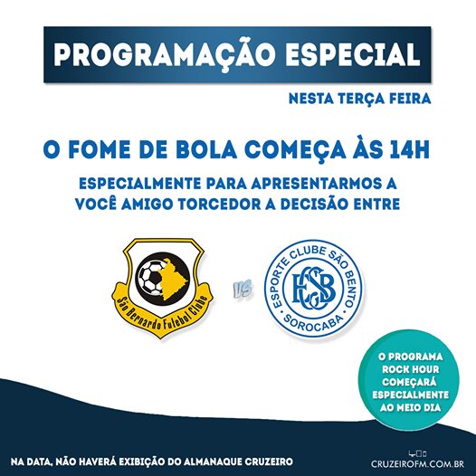 Até as 17h a transmissão será em todas as plataformas, FM 92,3 no site www.cruzeirofm.com.br no app da Emissora e nas Redes Sociais, facebook.com/cruzeirofm e YouTube.com/radiocruzeirofm.