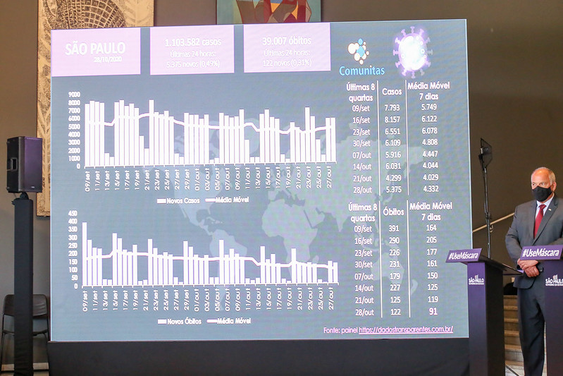 Ao todo, São Paulo registra 1.103.582 casos e 39.007 mortes decorrentes do novo coronavírus. A taxa de ocupação de UTIs é de 39,2%, com 3.147 pacientes internados em UTI e outros 4.123 em enfermarias, entre casos confirmados e suspeitos.