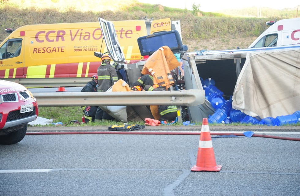 Segundo a CCR, o caminhão bateu em uma defensa metálica instalada no canteiro central da via. Na sequência, capotou no acostamento.
