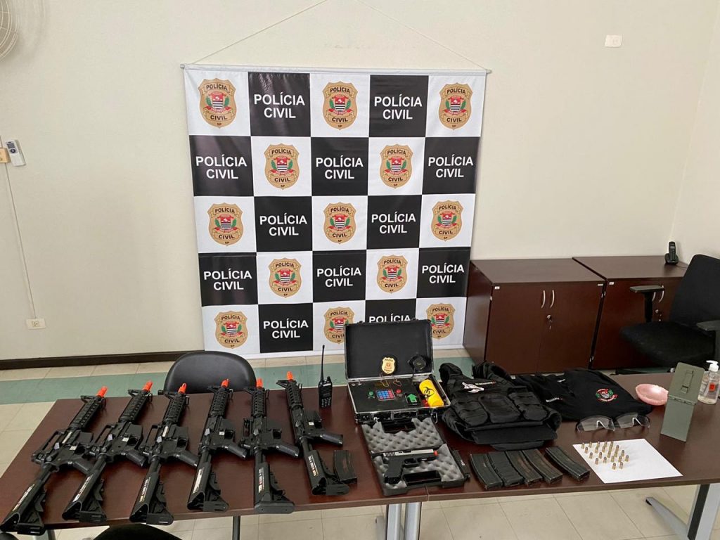 No apartamento de um jovem, de 22 anos, foram apreendidas diversas réplicas do tipo airsoft de fuzis ‘AR 15’ e de uma pistola ‘Glock’ , camisetas e distintivos da Polícia Civil, coletes e equipamentos táticos, além de munições calibre 380.