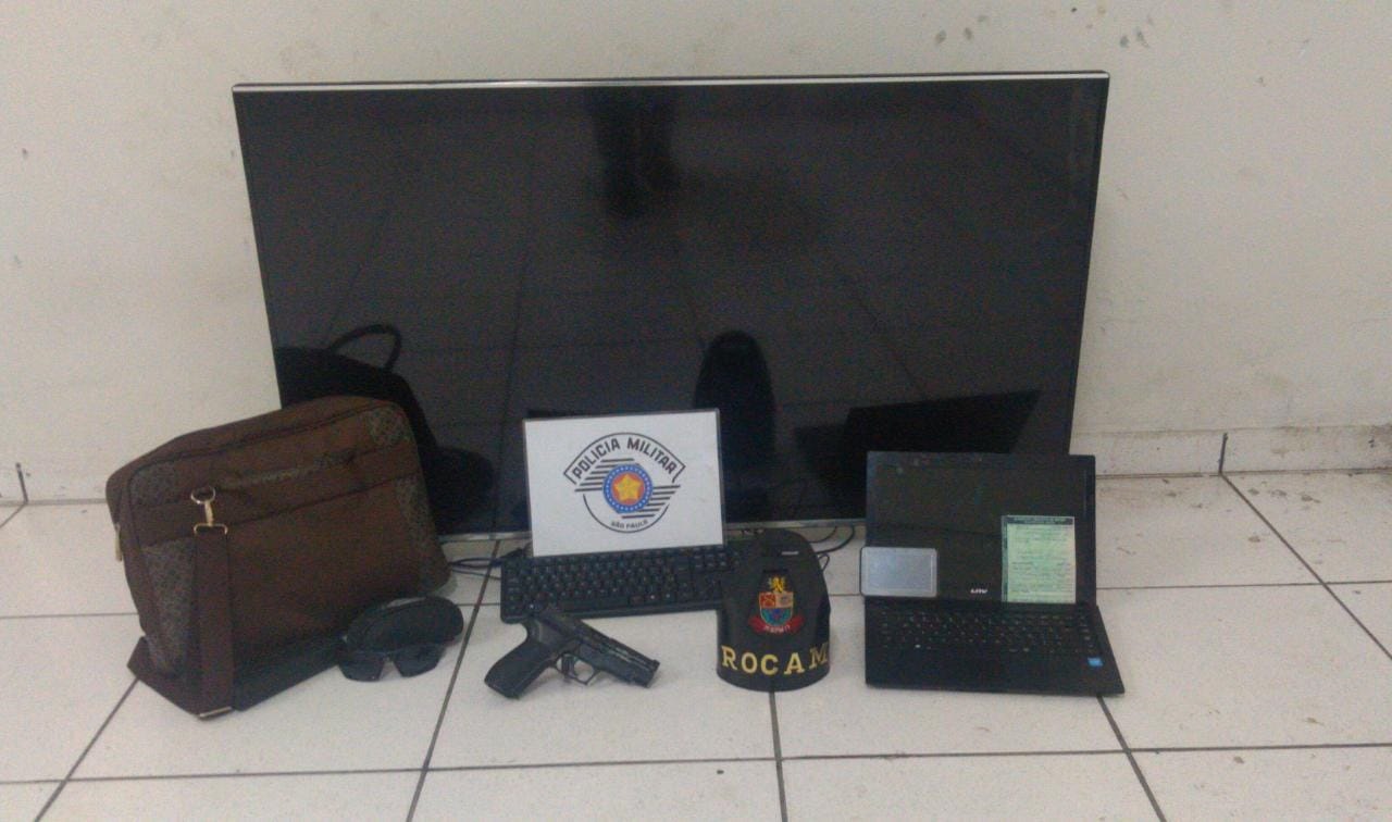 Os policiais fizeram a abordagem e dentro do carro estavam o adolescente e o maior de idade, além dos produtos roubados da residência e a pistola falsa.