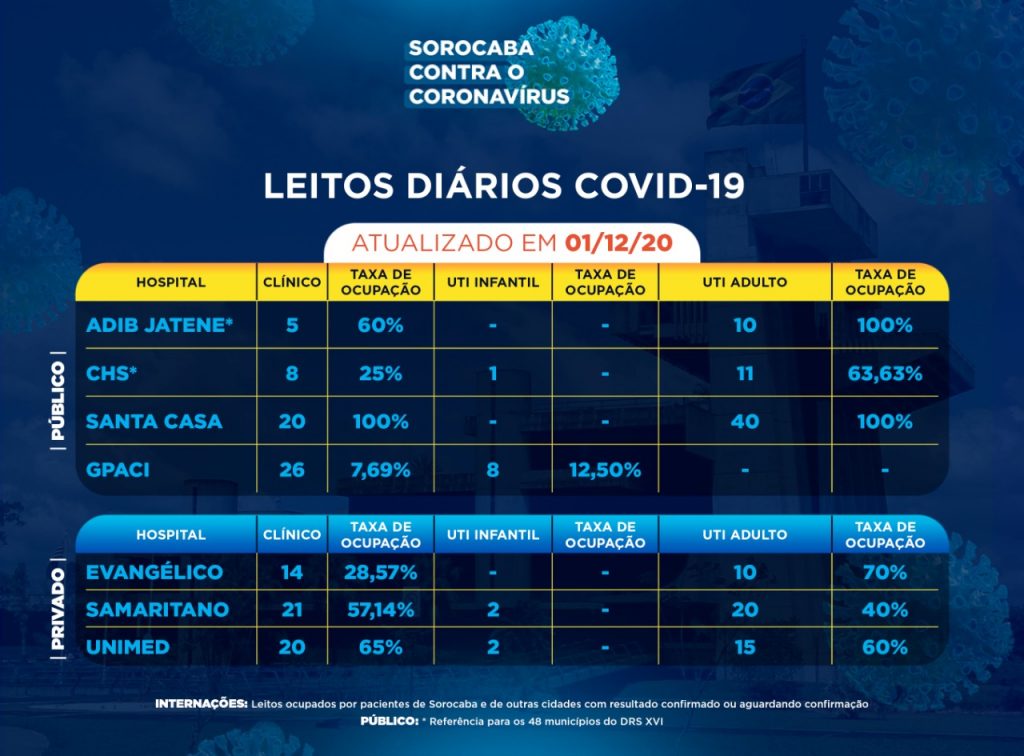 A Santa Casa de Sorocaba e o Hospital Estadual Adib Jatene têm 100% dos leitos das UTIs Covid ocupados nesta terça-feira (1.°), segundo boletim divulgado pela Prefeitura de Sorocaba.