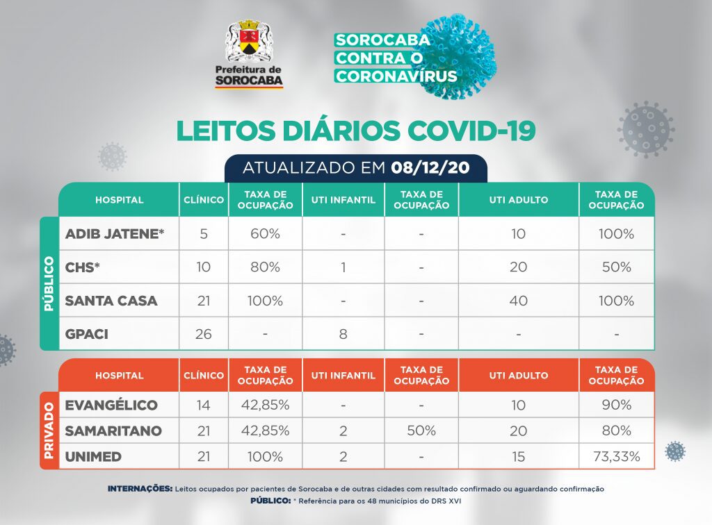 A Santa Casa de Sorocaba e o Hospital Regional Adib Jatene têm hoje (8) mais um dia de 100% de ocupação dos leitos de UTI para os pacientes com a Covid-19, com um total de 50 leitos (40 na Santa Casa e 10 no novo Regional).