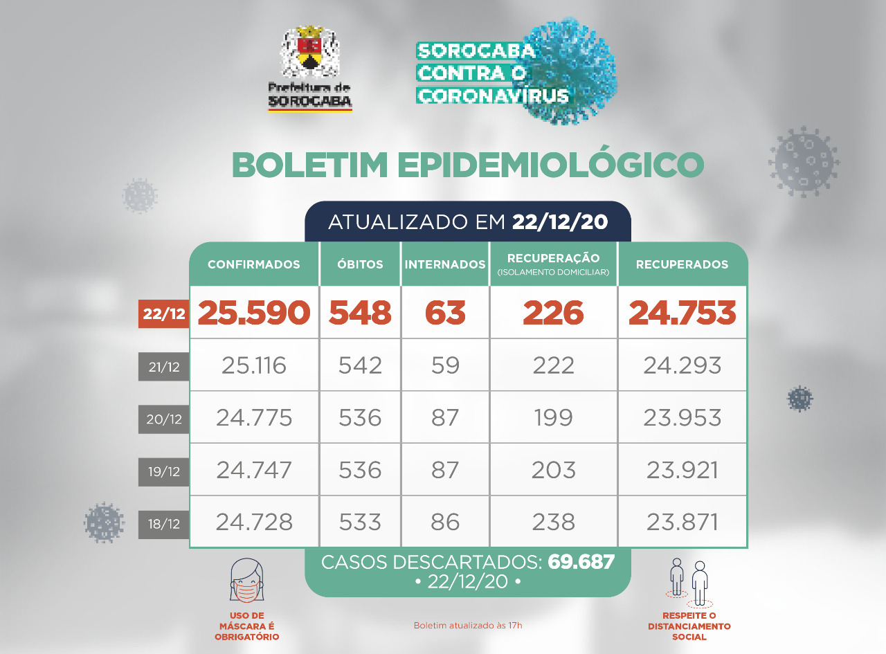 Sorocaba recebeu a notificação de mais 474 novos casos confirmados da Covid-19 nesta terça-feira (22). Do total de confirmados, 63 estão internados (36 em UTI).