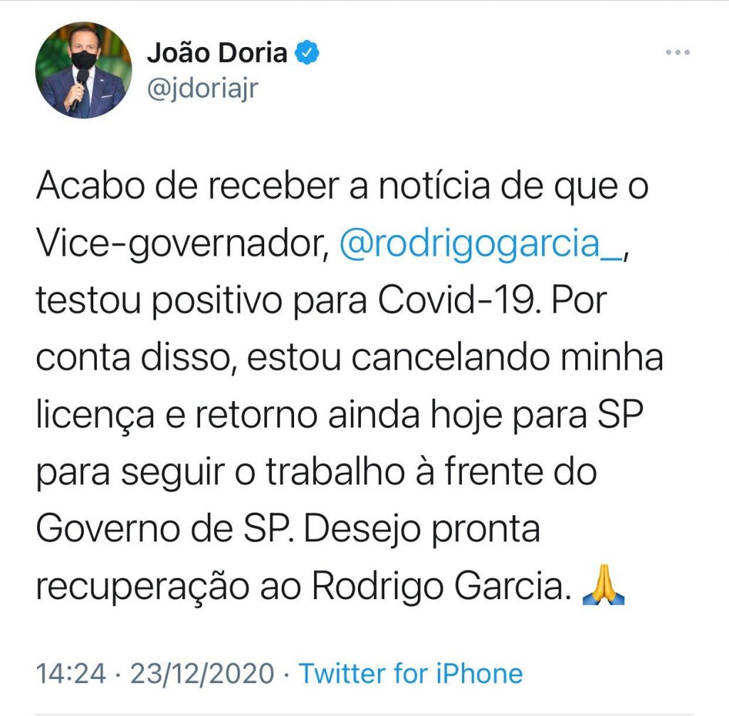 O governador João Doria postou há pouco no Twitter que vai retornar a São Paulo para reassumir o governo paulista após o vice-governador Rodrigo Garcia (DEM) testar positivo para a Covid-19 na manhã desta quarta-feira (23).
