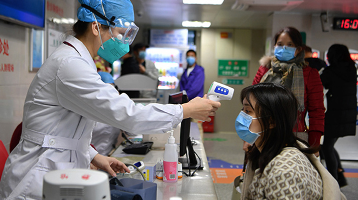 Fujian 01 02 2020 Um médico verifica a temperatura corporal de uma mulher em um hospital em Fuzhou, província de Fujian, no sudeste da China,. Várias medidas são tomadas na China para combater o novo coronavírus.foto Gov Cn