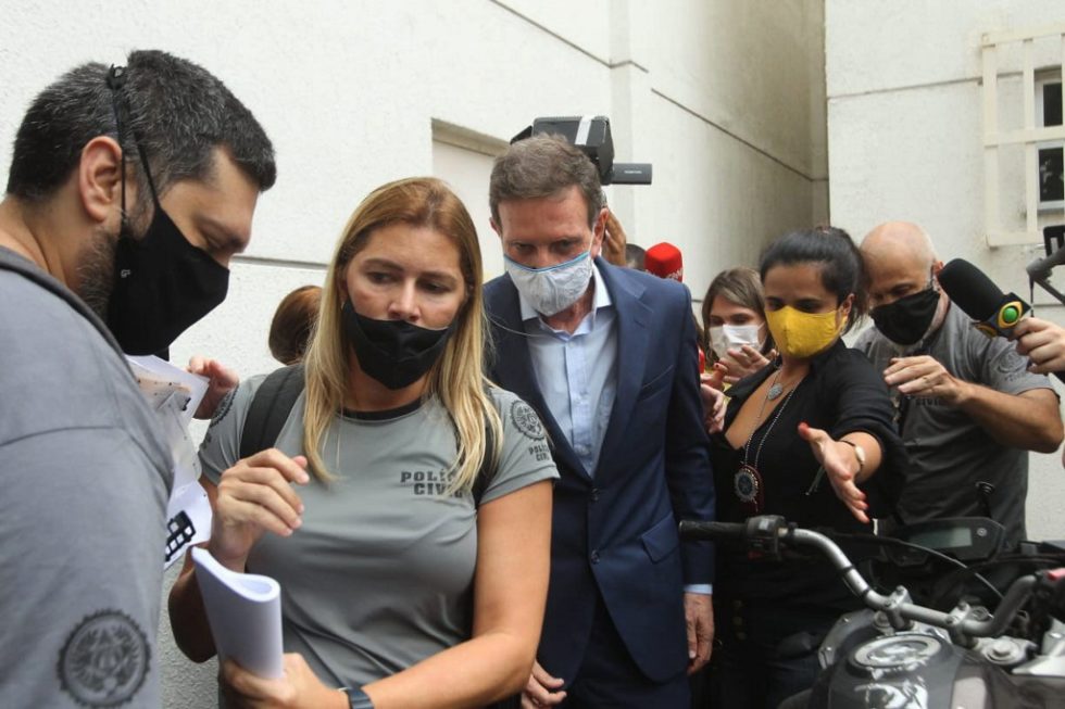 Picture released by Agencia o Dia showing Rio de Janeiro's Mayor Marcelo Crivella (C) while being arrested as part of an investigation into corruption at the municipality, during an operation by the Civil Police and the Public Ministry of Rio de Janeiro (MP-RJ) in Rio de Janeiro, Brazil, on December 22, 2020. - Several other people were also arrested as part of the same operation including businessman Rafael Alves, who is suspected of being the brain behind the operation. According to the investigation, which began in 2018, companies that wanted to secure contracts with Riotur gave checks to Rafael Alves. (Photo by Estefan RADOVICZ / AGENCIA O DIA / AFP) / RESTRICTED TO EDITORIAL USE - MANDATORY CREDIT "AFP PHOTO / AGENCIA O DIA / ESTEFAN RADOVICZ" - NO MARKETING - NO ADVERTISING CAMPAIGNS