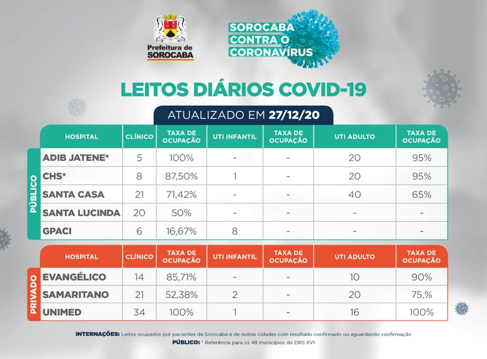 Mais uma morte em decorrência do novo coronavírus foi registrada neste domingo. A vítima é um homem de 77 anos, sem comorbidades relatadas. Ele faleceu em hospital público de Sorocaba no dia 27 de dezembro. Agora, os óbitos com confirmação da doença subiram para 552.