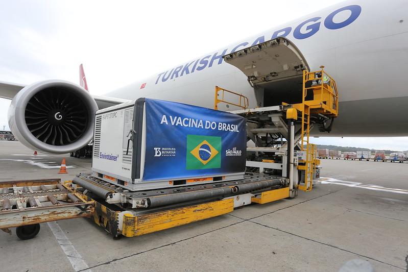 A carga desembarcou por volta de 11h30 no aeroporto de Guarulhos. O voo da Turkish Airlines saiu de Pequim, na China, e fez escala na Turquia. Todo o lote que chegou hoje é composto por doses já prontas para a aplicação.