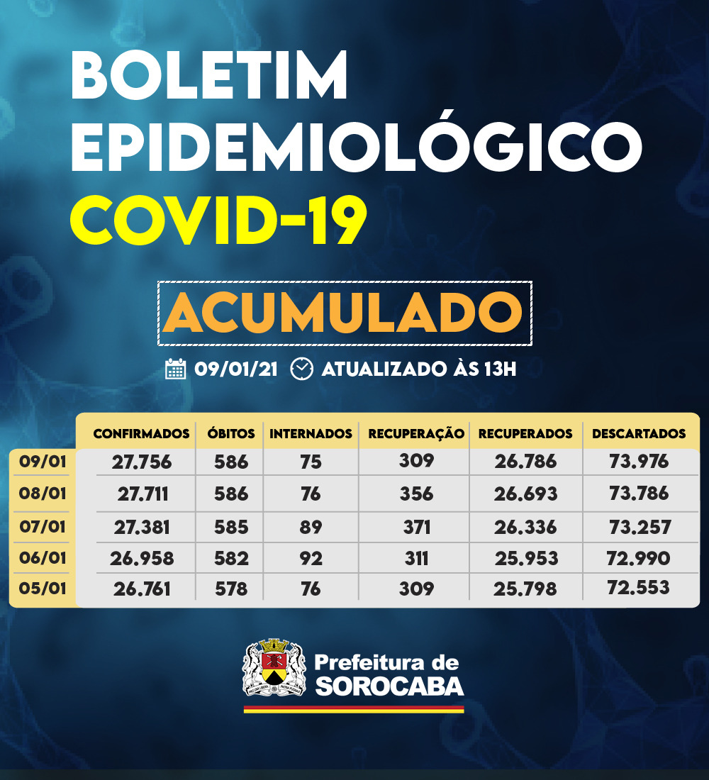 A Prefeitura de Sorocaba, por meio da Secretaria da Saúde (SES), registrou aumento nos recuperados da Covid-19 neste sábado (9) chegando ao total de 26.786. Já, os casos confirmados com a doença passaram de 27.711 para 27.756 na cidade. Os óbitos com a confirmação da doença se mantiveram em 586 e a taxa de letalidade no município é de 2,11%, abaixo da taxa estadual, que é de 3,1% e da nacional, que se encontra em 2,5%.