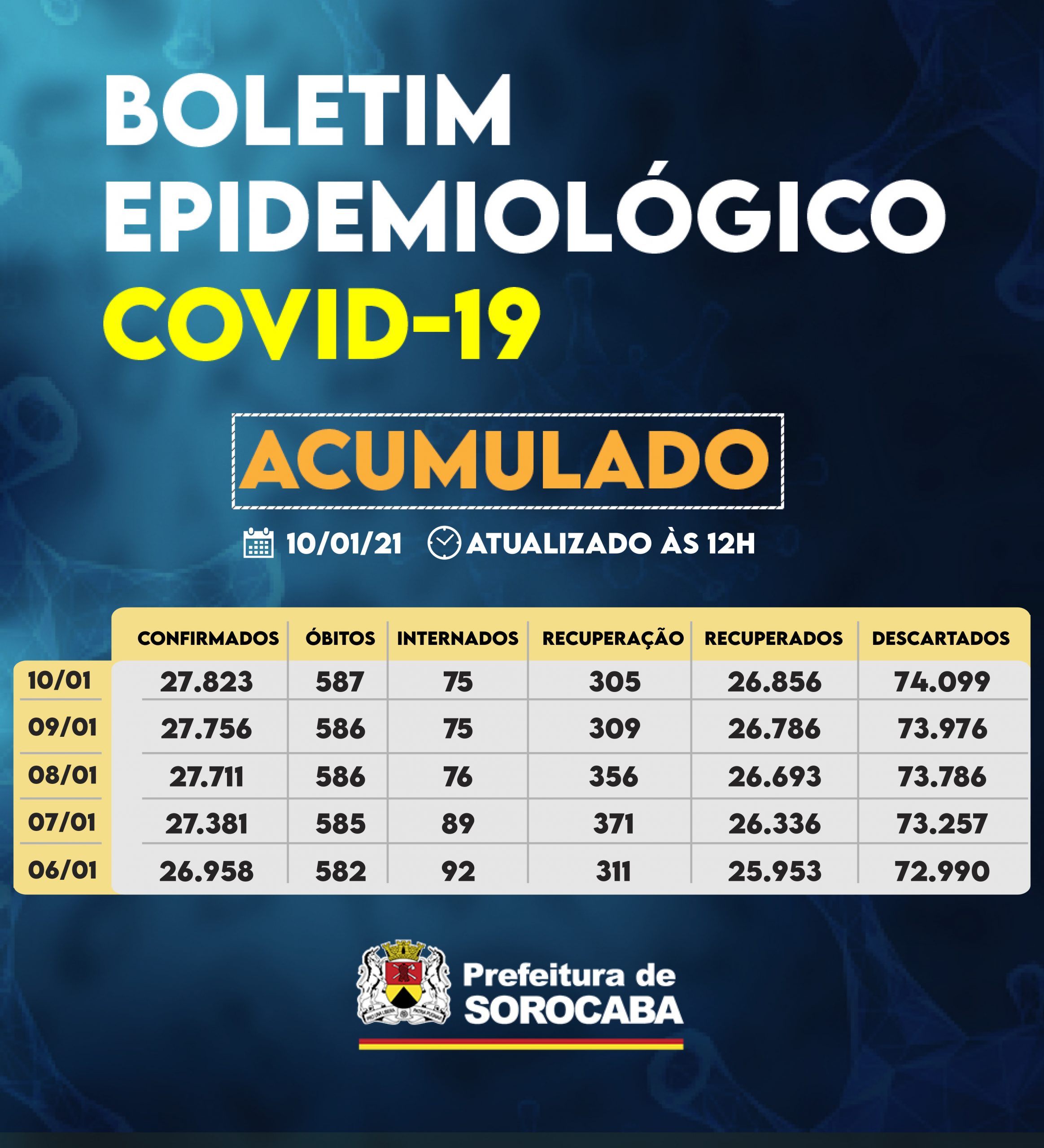 A Prefeitura de Sorocaba, por meio da Secretaria da Saúde (SES), registrou aumento nos recuperados da Covid-19 neste domingo (10) chegando ao total de 26.856. Já, os casos confirmados com a doença passaram de 27.756 para 27.823 na cidade. Os óbitos com a confirmação da doença aumentaram para 587 e a taxa de letalidade no município é de 2,10%, abaixo da taxa estadual, que é de 3,1% e da nacional, que se encontra em 2,5%.