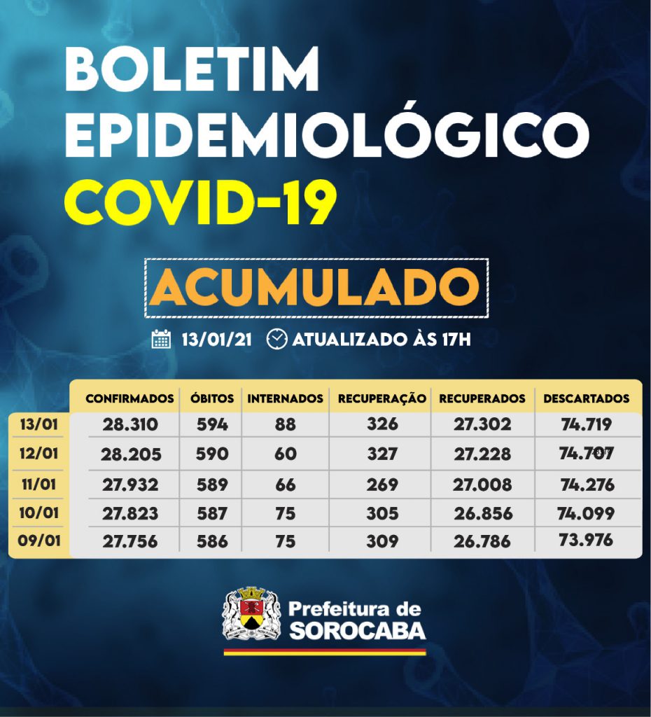 Sorocaba recebeu a notificação de mais 105 casos confirmados da Covid-19, 74 recuperados e quatro óbitos nesta quarta-feira (13). Do total de confirmados, 88 estão internados (41 em UTI) e o total de pessoas em recuperação (isolamento domiciliar) é 326.