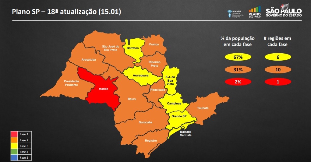As regiões de Araçatuba, Bauru, Franca, Piracicaba, São José do Rio Preto, Franca e Taubaté regrediram da fase amarela para a laranja. Assim como Sorocaba, a região de Registro e Presidente Prudente ficam no laranja e a região de Marília foi da etapa laranja para a vermelha, a mais restritiva do plano.