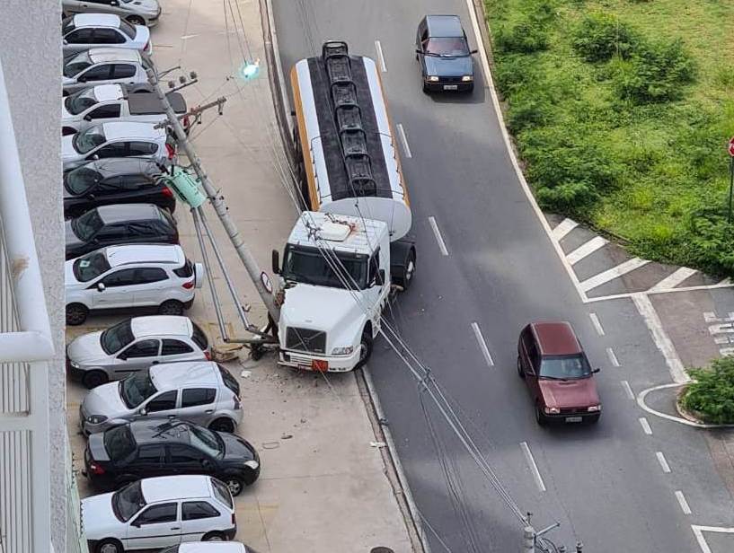 Um caminhão carregado com combustível colidiu e derrubou um poste em frente ao Eco Park Residencial, que fica na Avenida Comendador Vicente do Amaral, 2.929, no Jardim Guarujá, em Sorocaba, por volta das 15h desta quarta-feira (20).