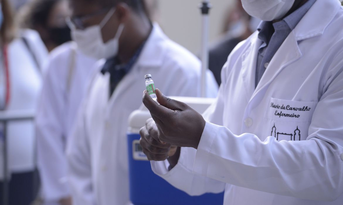 Servidor da Fiocruz prepara vacina de Oxford/AstraZeneca para a primeira aplicação no Brasil.