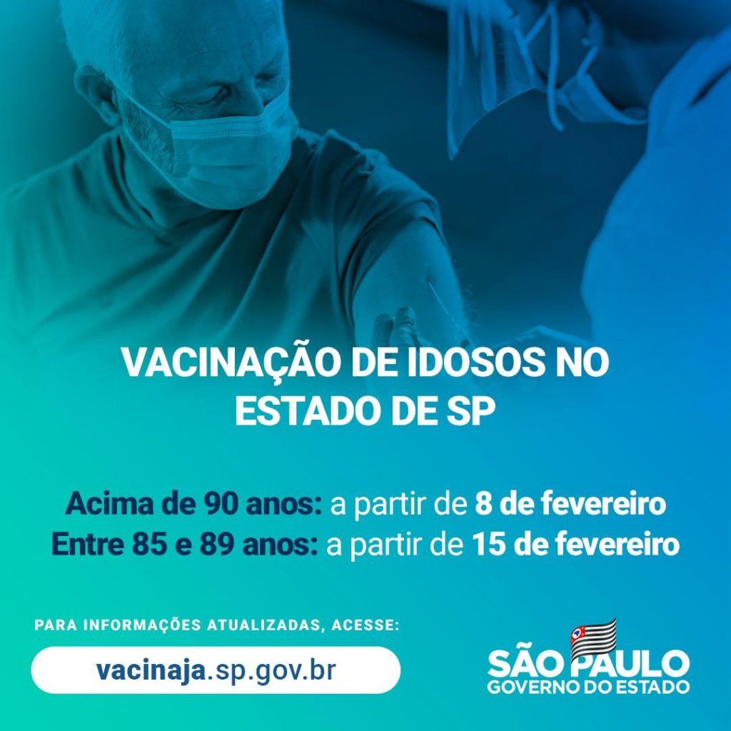 O governo do estado de São Paulo anunciou nesta sexta-feira (29) o início da vacinação de idosos acima de 90 anos para 8 de fevereiro e, para aqueles acima de 85 anos, para o próximo dia 15.