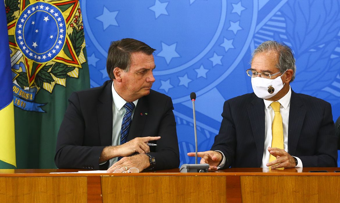 O presidente Jair Bolsonaro e o ministro da Economia, Paulo Guedes, durante pronunciamento sobre preço dos combustíveis e a política de reajustes adotada pela Petrobras.