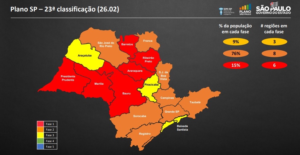 Com isso, 76% do estado está na fase laranja do Plano São Paulo, 15% na vermelha e 9% na amarela.