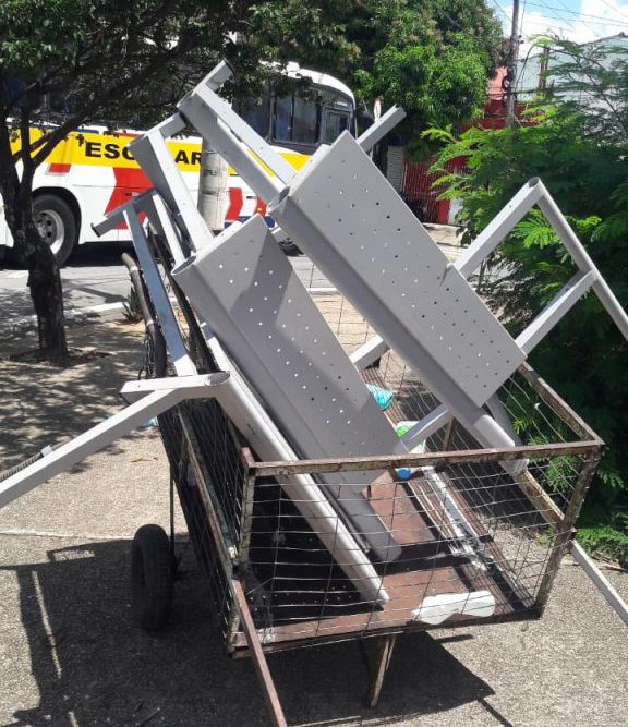 De imediato, foi constatada a tentativa de furto de três bases e pernas de metal de mesas, que já tinham sido colocadas dentro de um carrinho que o homem levava.