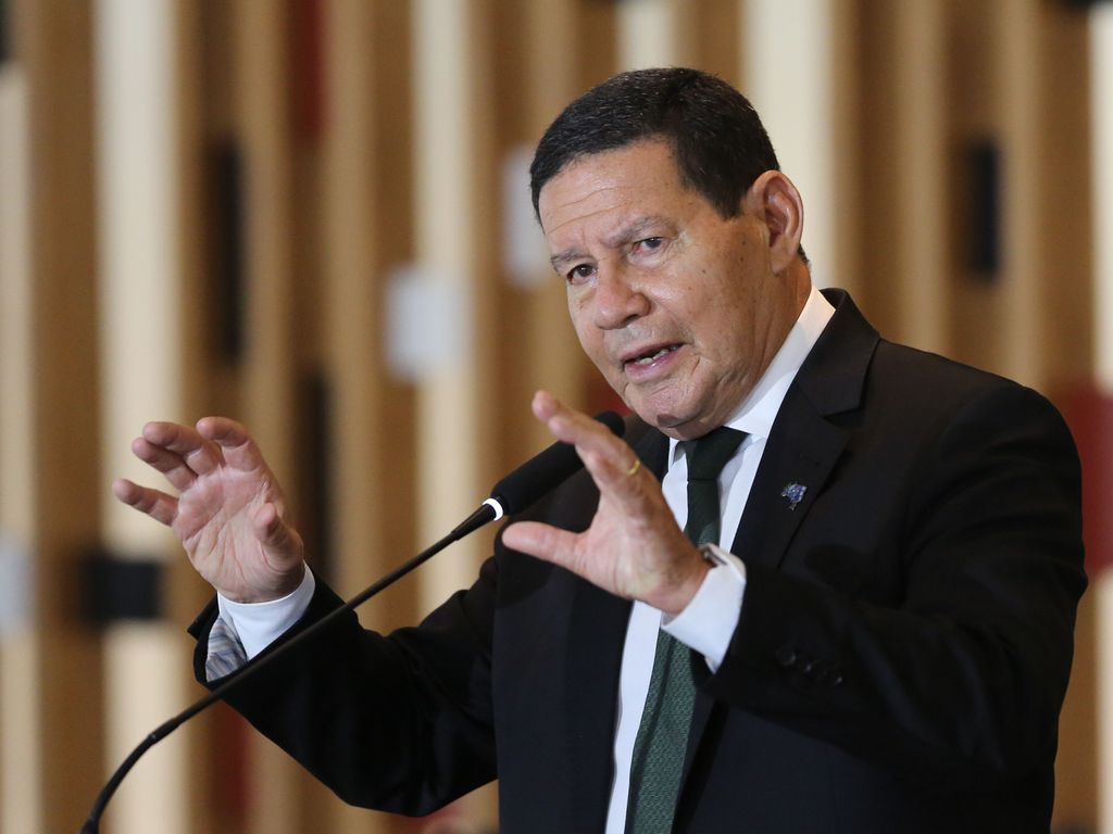 O vice-presidente da República e presidente do Conselho Nacional da Amazônia Legal, Hamilton Mourão, fala à imprensa, após a terceira reunião do colegiado, no Palácio Itamaraty em Brasília
