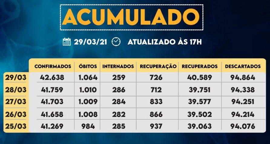 Do total de confirmados, 259 estão internados (158 em UTI) e o total de pessoas em recuperação (isolamento domiciliar) é 726.