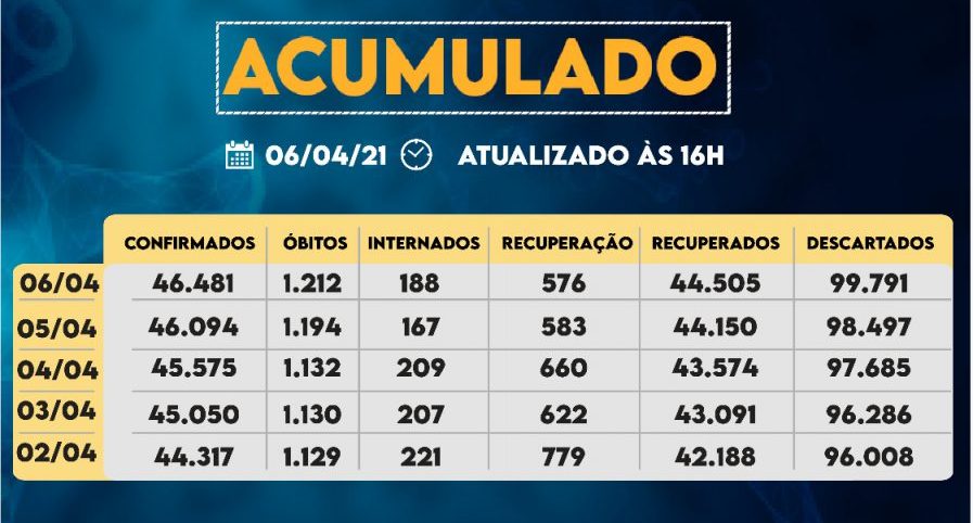 Com os dados de hoje, houve aumento do número de recuperados da Covid-19, chegando ao total de 44.505. Já, os casos confirmados com a doença passaram de 46.094 para 46.481 na cidade. Os óbitos com a confirmação da doença subiram para 1.212.