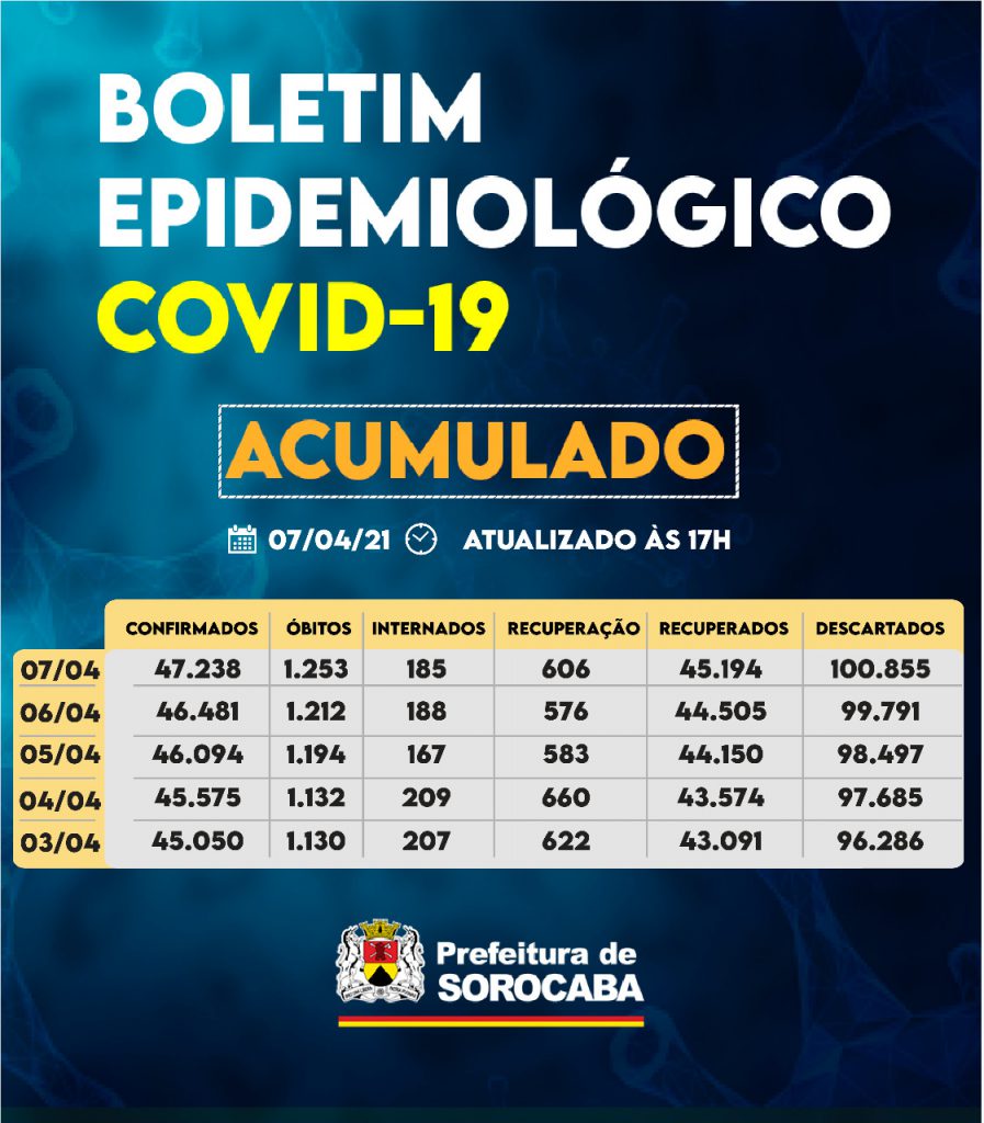 A Prefeitura de Sorocaba, por meio da Secretaria da Saúde (SES), registrou aumento do número de recuperados da Covid-19 nesta quarta-feira (7), chegando ao total de 45.194. Já, os casos confirmados com a doença passaram de 46.481 para 47.238 na cidade. Os óbitos com a confirmação da doença subiram para 1.253 e a taxa de letalidade no município é de 2,6%, abaixo da taxa estadual, que é de 3,1%, e igual a taxa nacional, que se encontra em 2,6%.