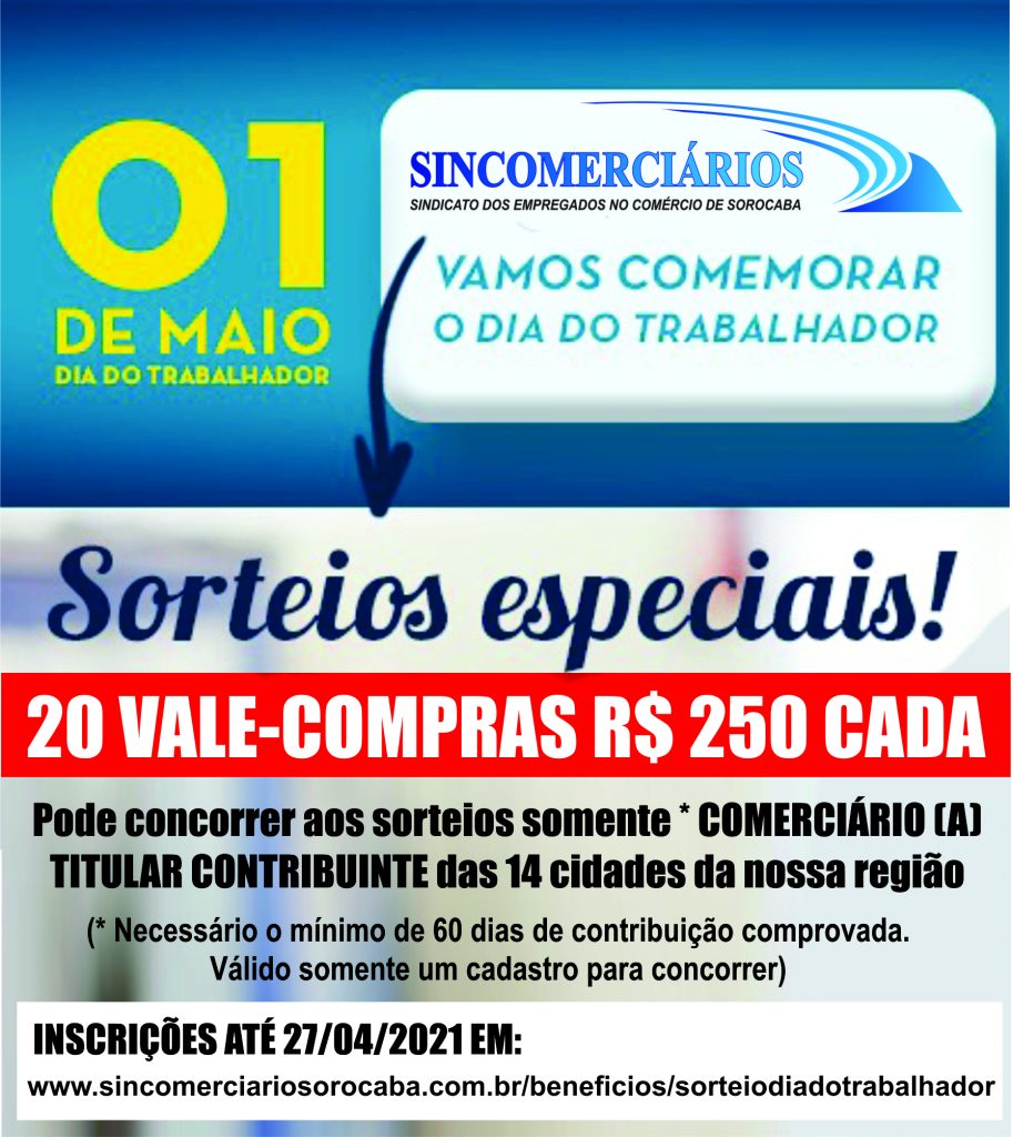 Em meio às dificuldades impostas pela pandemia de Covid-19 e em homenagem ao Dia do Trabalhador, o Sincomerciários de Sorocaba e Região promove uma ação especial aos comerciários contribuintes. Serão sorteados 20 vale-compras no valor de R$ 250,00 cada um para os comerciários das 14 cidades que são representadas pelo Sincomerciários de Sorocaba e Região.
