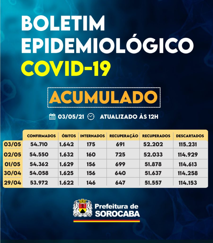 A Prefeitura de Sorocaba, por meio da Secretaria da Saúde (SES), registrou aumento do número de recuperados da Covid-19 nesta segunda-feira (3), chegando ao total de 52.202. Já, os casos confirmados com a doença passaram de 54.550 para 54.710 na cidade. Os óbitos com a confirmação da doença subiram para 1.642 e a taxa de letalidade no município é de 3%, abaixo da taxa estadual, que é de 3,3%, e acima da taxa nacional, que se encontra em 2,8%.