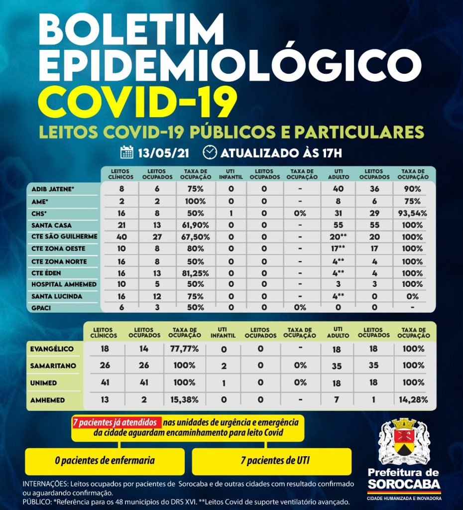 No censo diário de leitos da Covid-19 desta quinta-feira (13), no Hospital Estadual Adib Jatene, seis leitos clínicos Covid estão ocupados, sendo oito pactuados. Já os 40 leitos de UTI Covid (Unidade de Terapia Intensiva) encontram-se 90% ocupados. Outro hospital de esfera estadual, o Conjunto Hospitalar de Sorocaba (CHS), possui 16 leitos clínicos Covid e oito estão ocupados. O único leito de UTI infantil Covid encontra-se sem paciente. Dos 31 leitos de UTI Covid disponibilizados neste hospital, 29 estão ocupados. O AME possui dois leitos clínicos covid e os dois estão ocupados. Dos oito leitos de UTI Covid deste local, seis possuem pacientes.