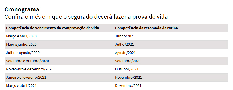 Mas isso será feito de forma escalonada. Veja abaixo o mês em que será preciso fazer a prova de vida, de acordo com o mês de vencimento em 2020.