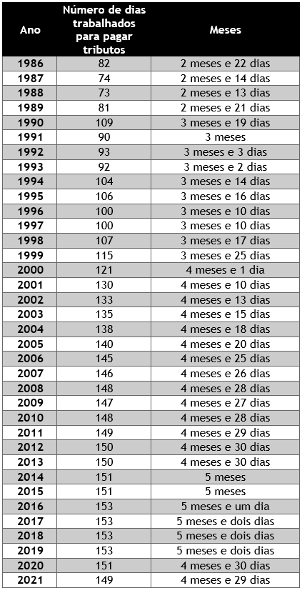 Desde o ano de 1986 é possível notar uma evolução, quase que constante, na quantidade de dias trabalhados para o pagamento de impostos. Mesmo com a pandemia, a média se mantém em alta neste ano, como explica o presidente executivo do IBPT, Dr. João Eloi Olenike. “Apesar de termos diminuído em dois dias, em virtude da pandemia e a retração econômica causada em razão dessa, o brasileiro ainda trabalha muitos dias do ano só para pagar tributos sobre a renda, o patrimônio e consumo. Além disso, tem que pagar por serviços particulares para suprir a ineficiência governamental, no que diz respeito ao péssimo retorno da arrecadação em termos de qualidade e quantidade, na oferta dos serviços públicos para a população”, ressaltou.