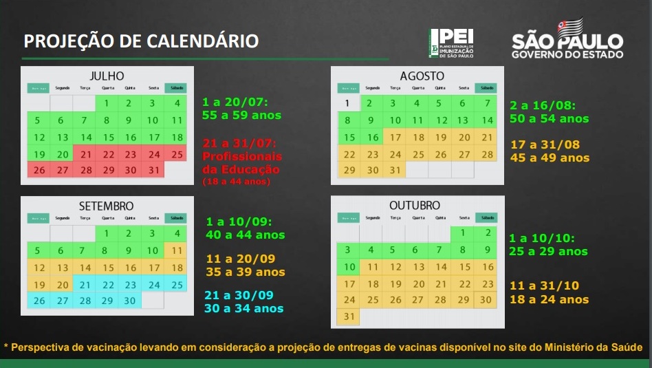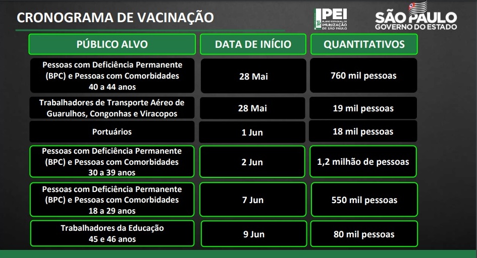 Já a imunização de 80 mil professores de 45 e 46 anos, que seria em julho, foi antecipada para o dia 9 de junho.